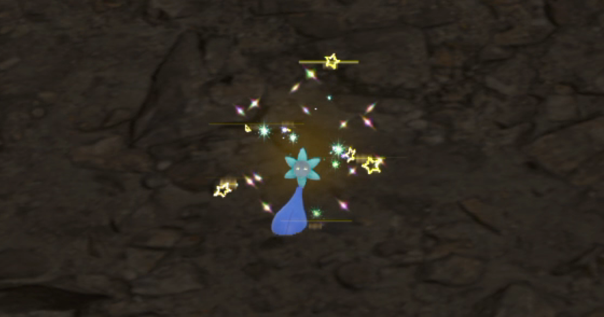 Shiny Glimmet has a blue body, and the six petals around its head turn a light cyan color.