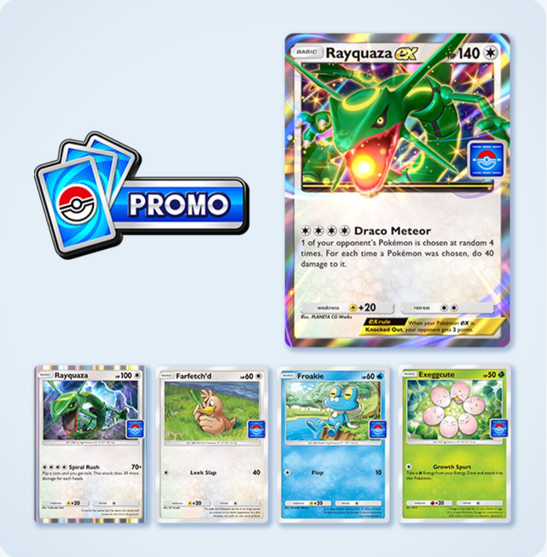 To access the Rayquaza ex promo card, as well as the other cards from Promo Pack A Series Vol. 7, you must win solo battles in the Rayquaza ex Drop Event.