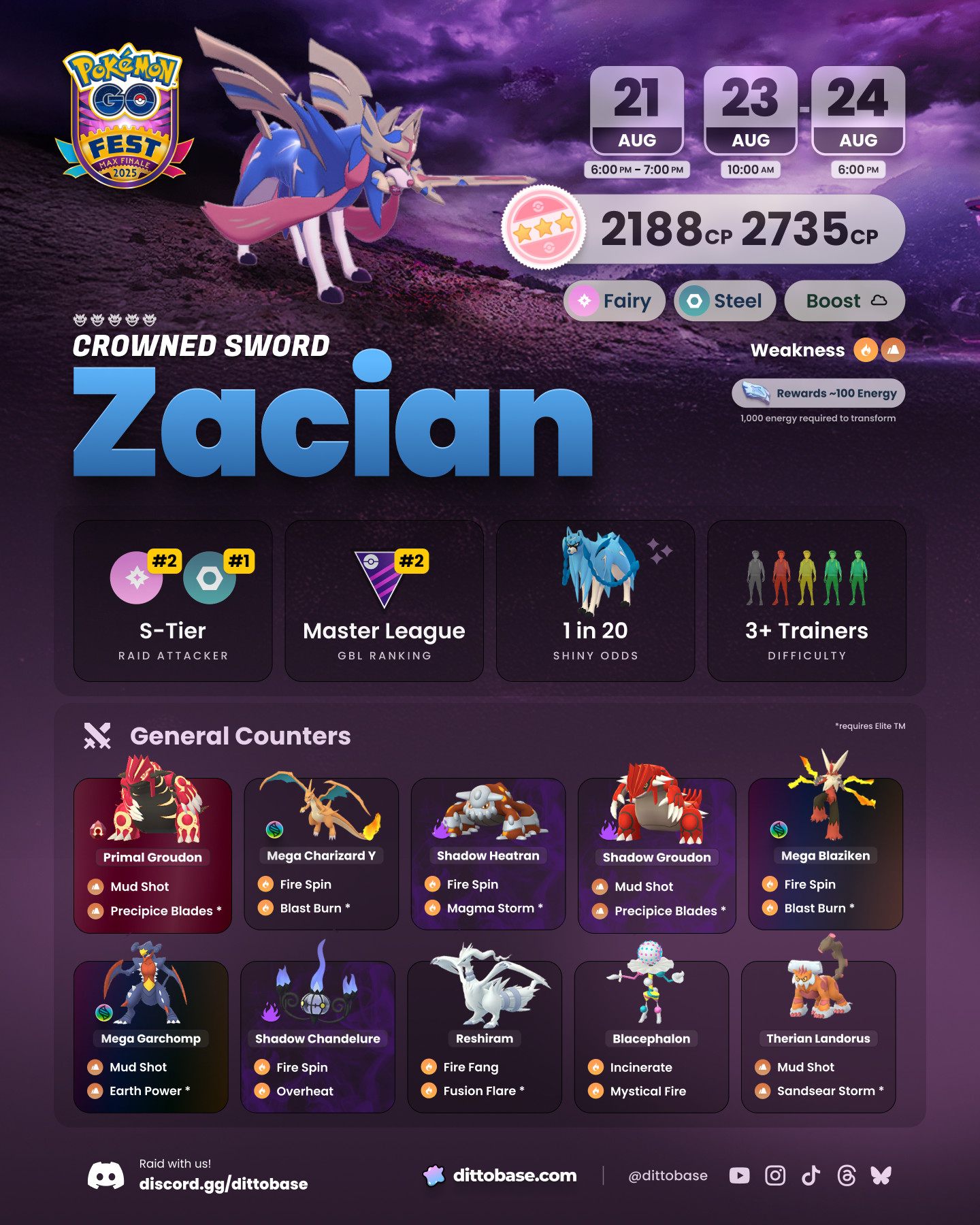 Crowned Zacian will be the featured Pokémon for Raid Hour on Thursday, August 21, 2025. From 6:00 - 7:00 p.m. local time there will be an increased amount of Crowned Zacian raids, with Crowned Zacian appearing at all gyms that can host one.