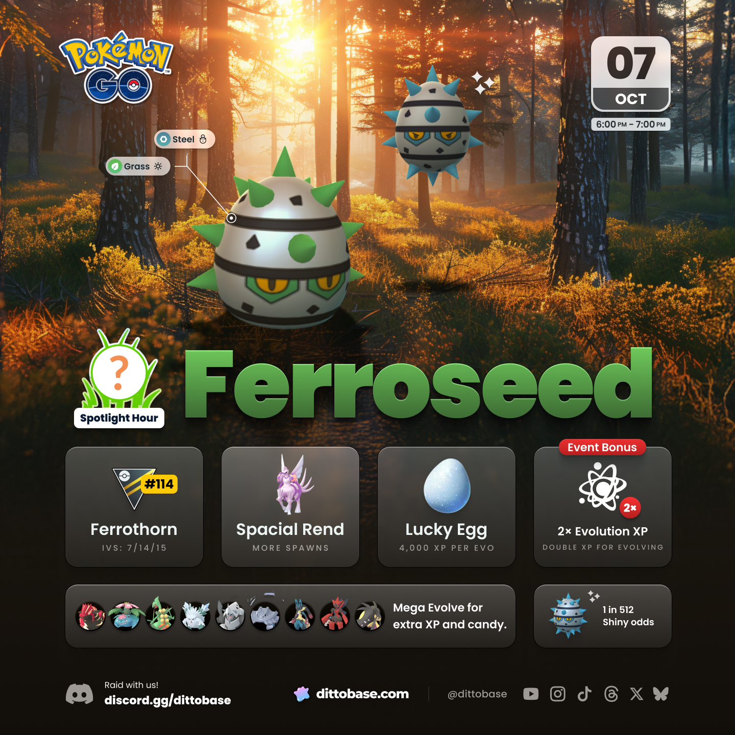 Ferroseed will be the featured Pokémon during the October 7 Pokémon Spotlight Hour. From 6:00 p.m. to 7:00 p.m. local time, trainers will receive 2× Evolution XP and Ferroseed will spawn much more frequently in the wild.
