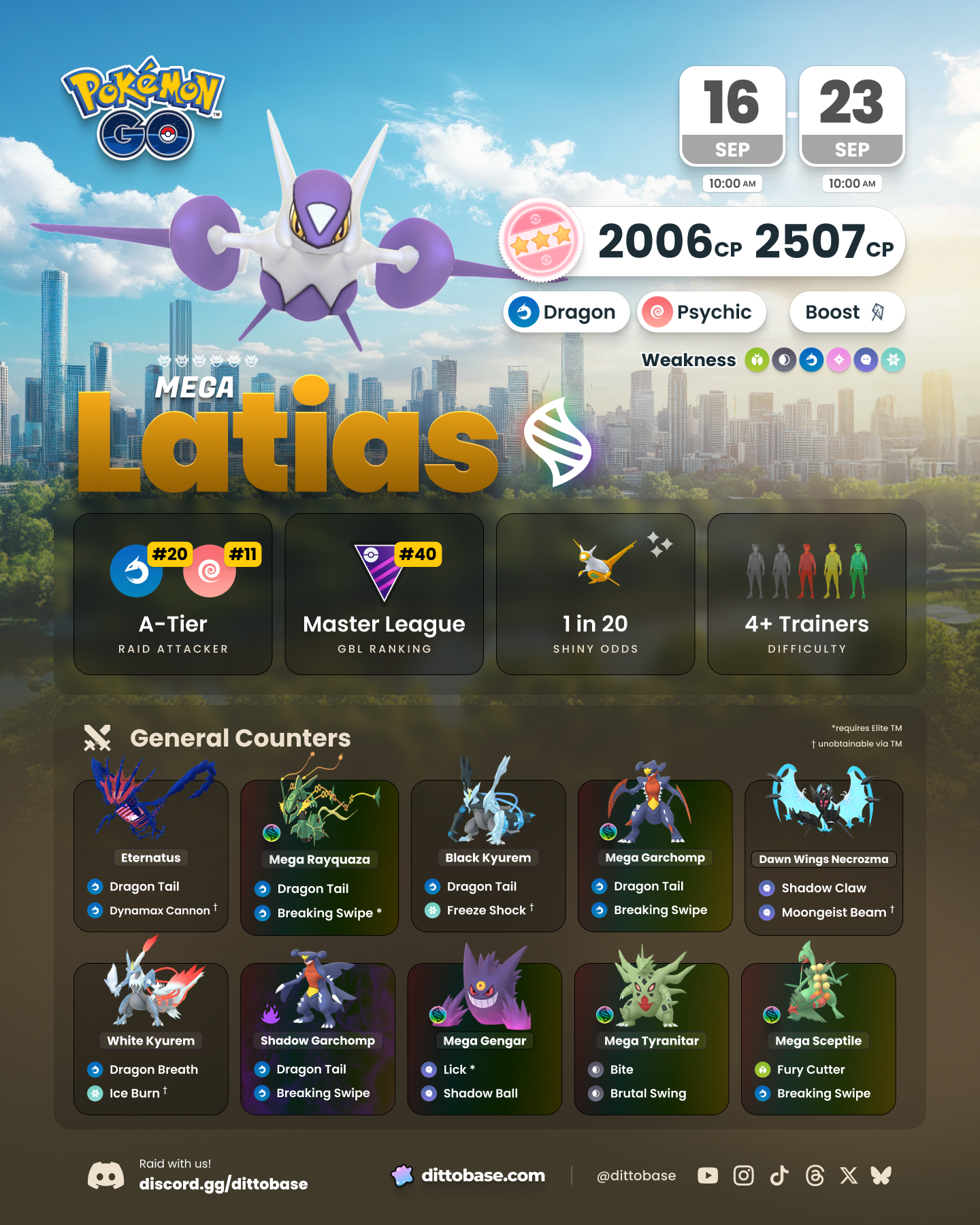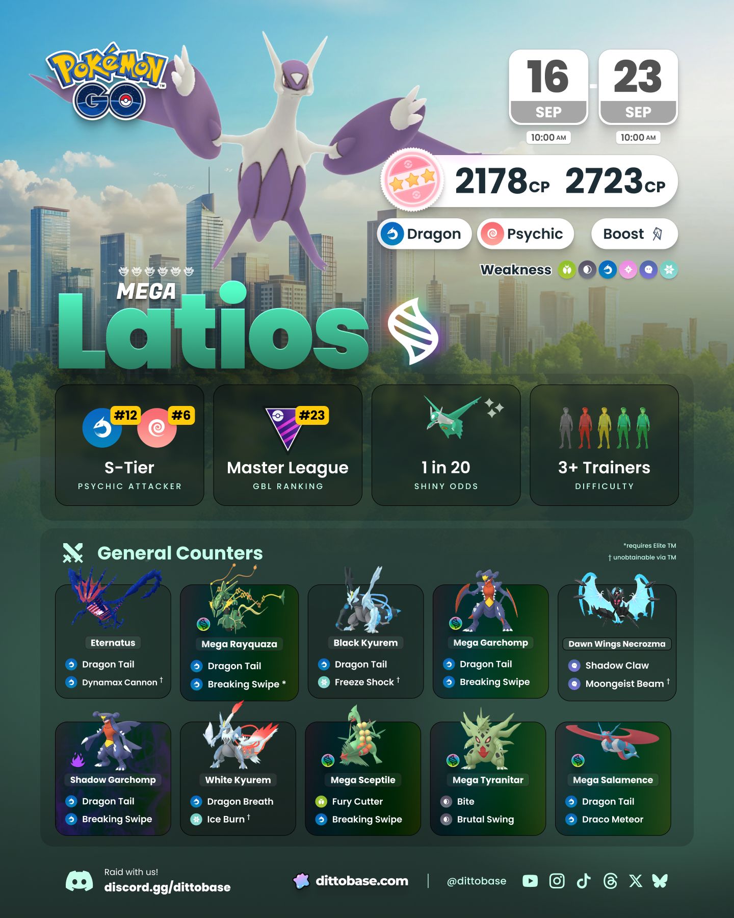 Mega Latias & Latios will be the featured Pokémon for Raid Hour on Wednesday, September 17, 2025. From 6:00 - 7:00 p.m. local time there will be an increased amount of Mega Latias & Latios raids, with Mega Latias & Latios appearing at all gyms that can host one.