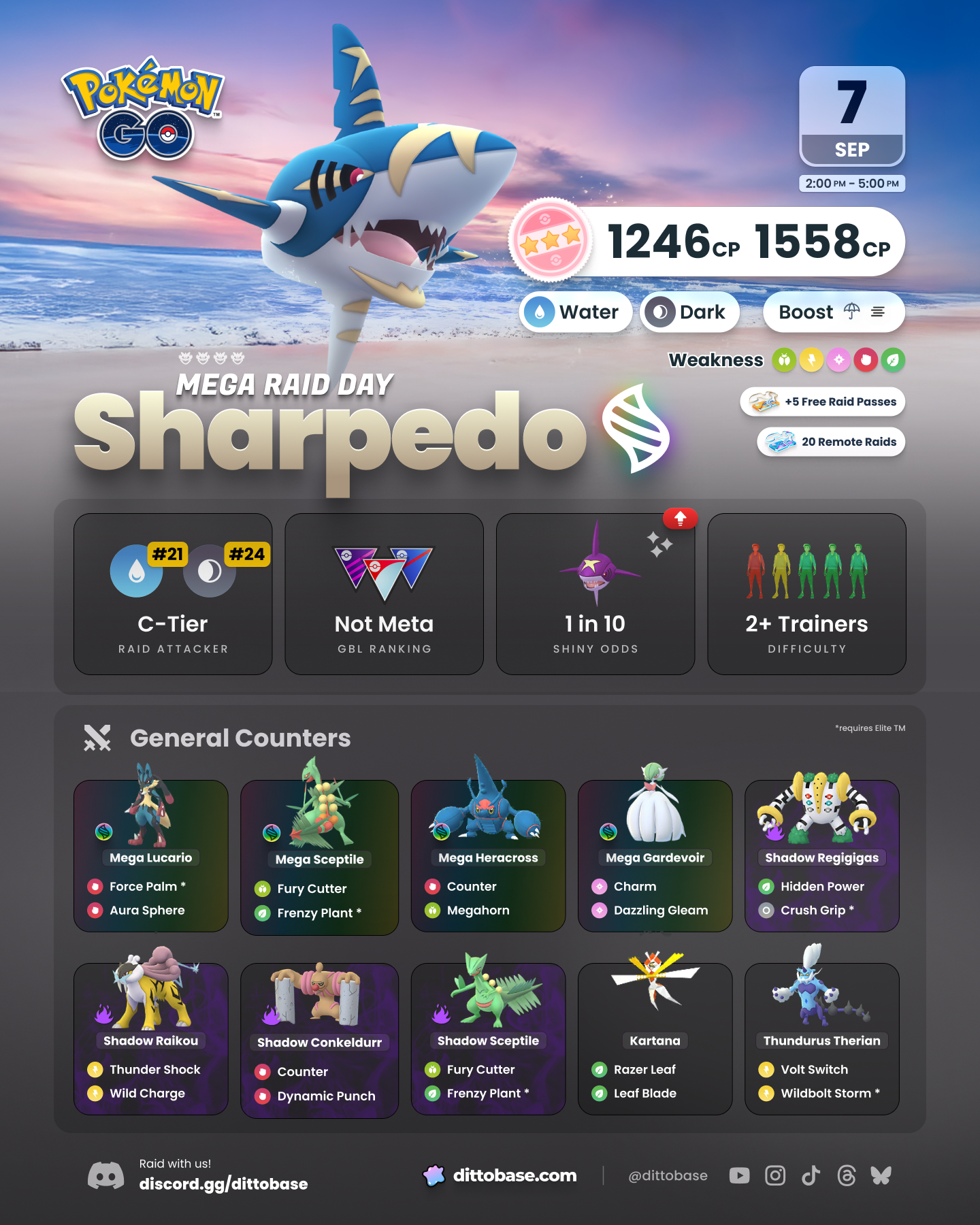 Mega Sharpedo Raid Day will happen on Sunday, September 7, 2025, from 2:00 p.m. to 5:00 p.m. local time.