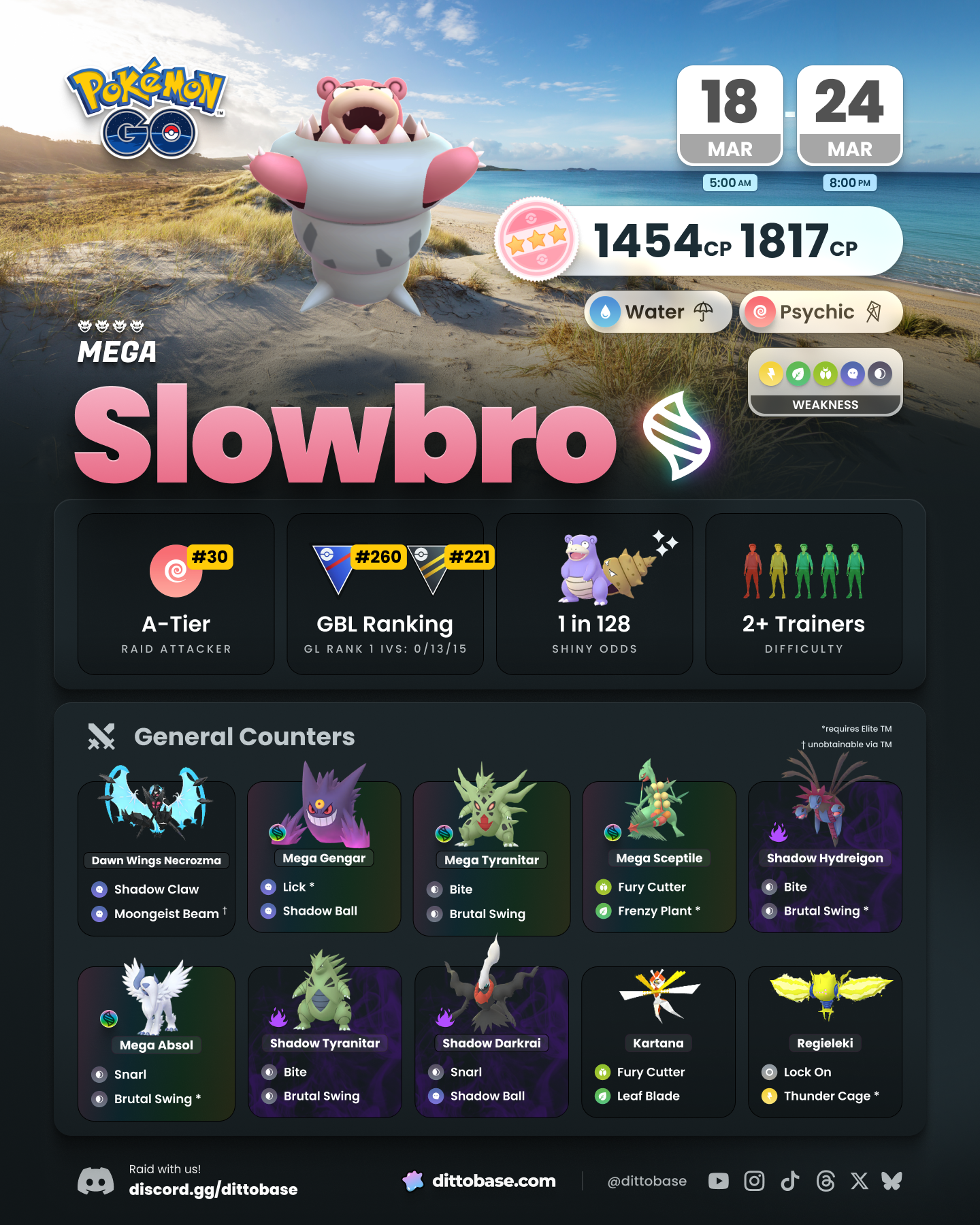 Mega Slowbro✨ will be appearing in Mega Raids from March 18 at 10:00 a.m. local time to March 24 at 10:00 a.m. local time.