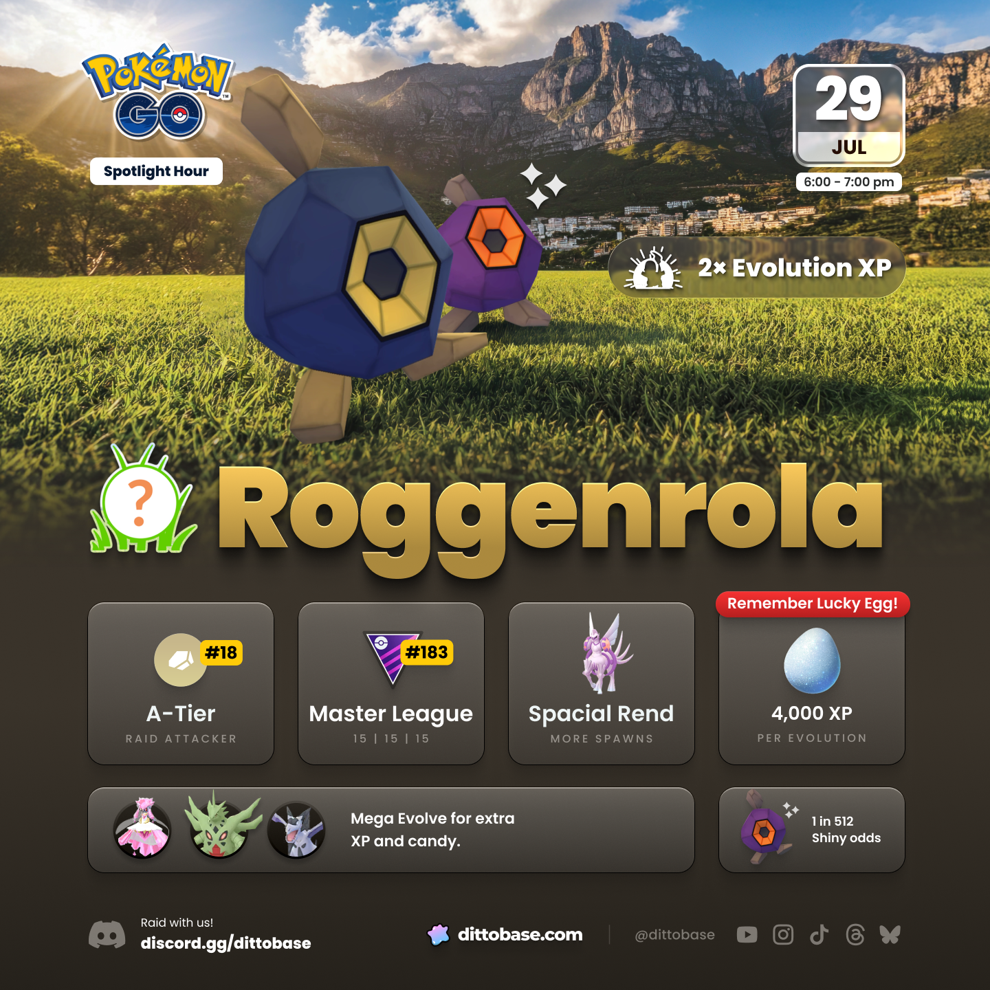 Roggenrola will be the featured Pokémon during the July 29 Pokémon Spotlight Hour. From 6:00 p.m. to 7:00 p.m. local time, trainers will receive 2× Evolution XP and Roggenrola will spawn much more frequently in the wild.
