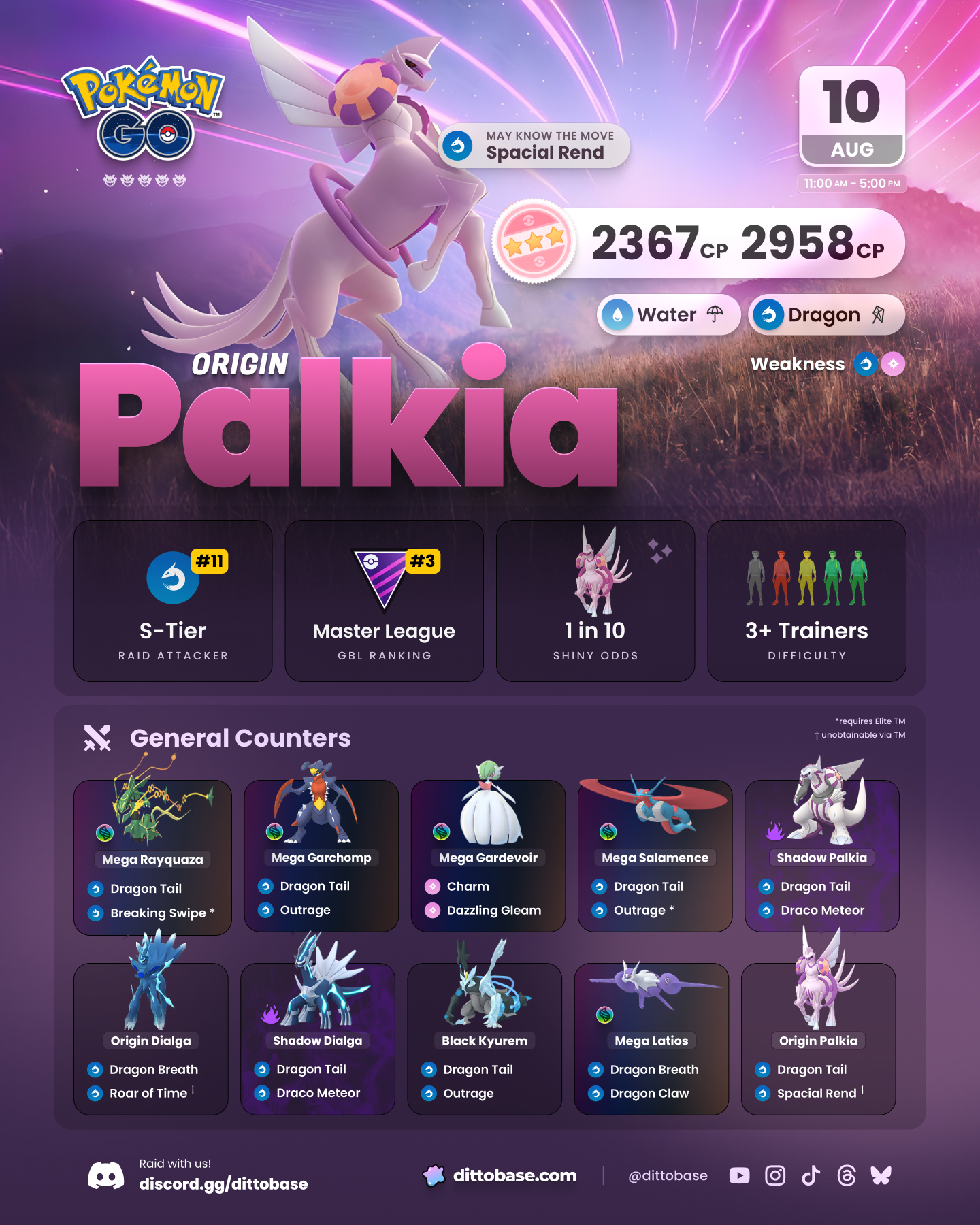 Origin Forme Palkia encountered in raids may know the Charged Attack