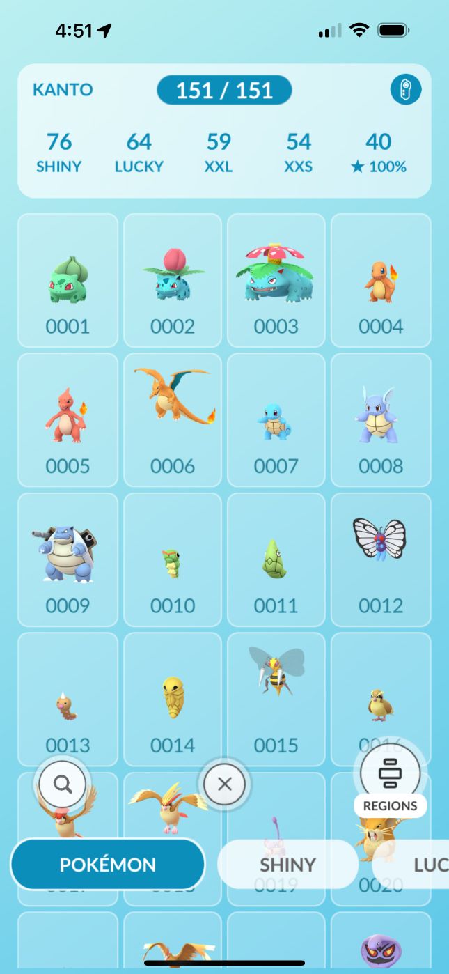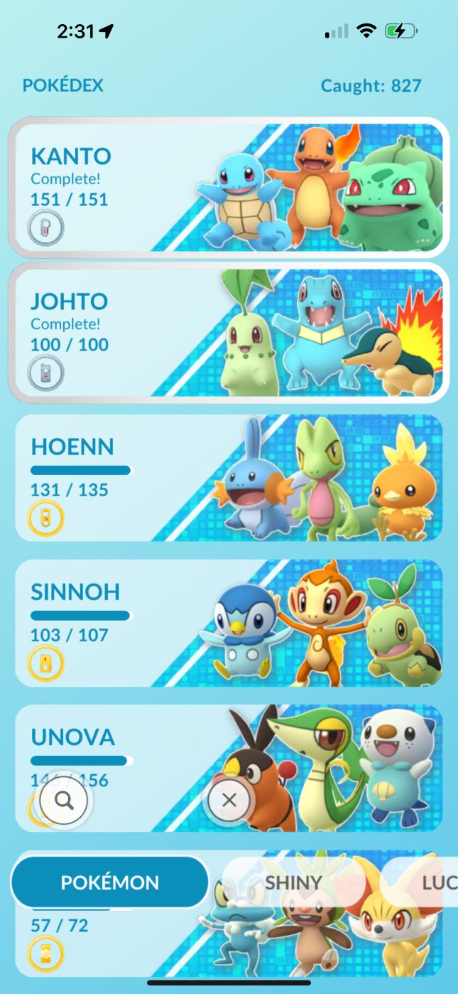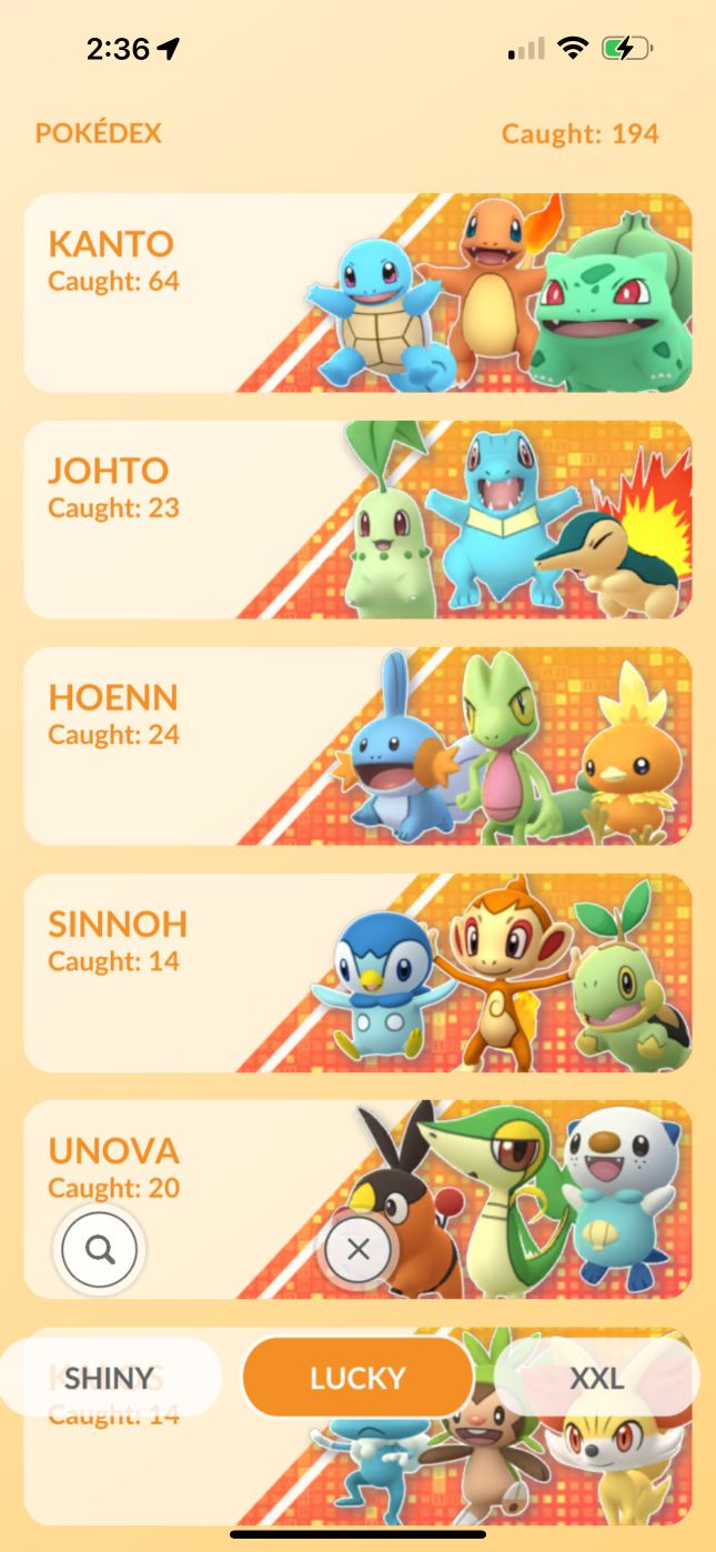 Tapping into one of the regions will let users scroll through all of their Pokémon. At the top of the screen is a new header with a region-based summary of your Pokédex entries. This summary is only shown if the "Pokémon" Pokédex category is selected. If one of the other categories is selected, such as "Lucky," the new header will show your three most recently caught Pokémon in that category.