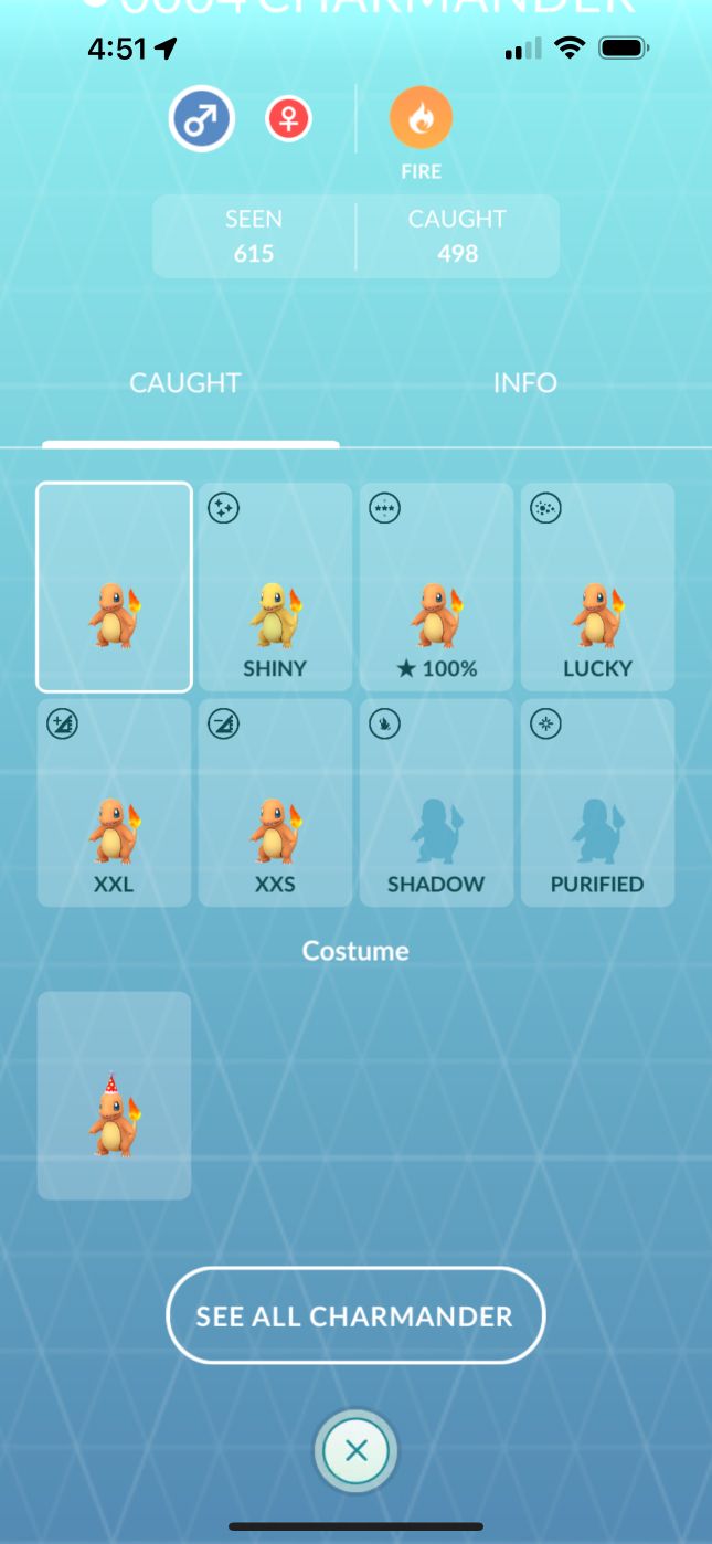 Scrolling further down, a section for costumes is also listed. Below costumes is a button to see all Pokémon of the selected species, which takes you to your Pokémon storage with the Pokémon's name pre-filled in the search box.