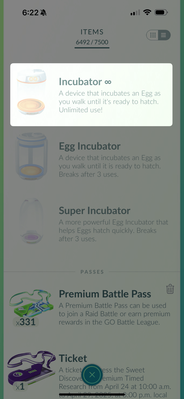 Infinite Incubator in a player's Pokémon GO inventory.