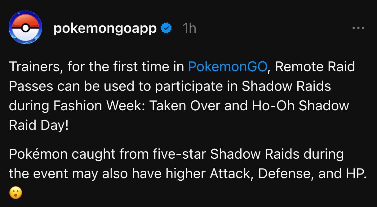 The official Shadow Ho-oh Raid Day blog post was also updated to include details about the Remote Raid limit being increased from five to twenty remote raids.