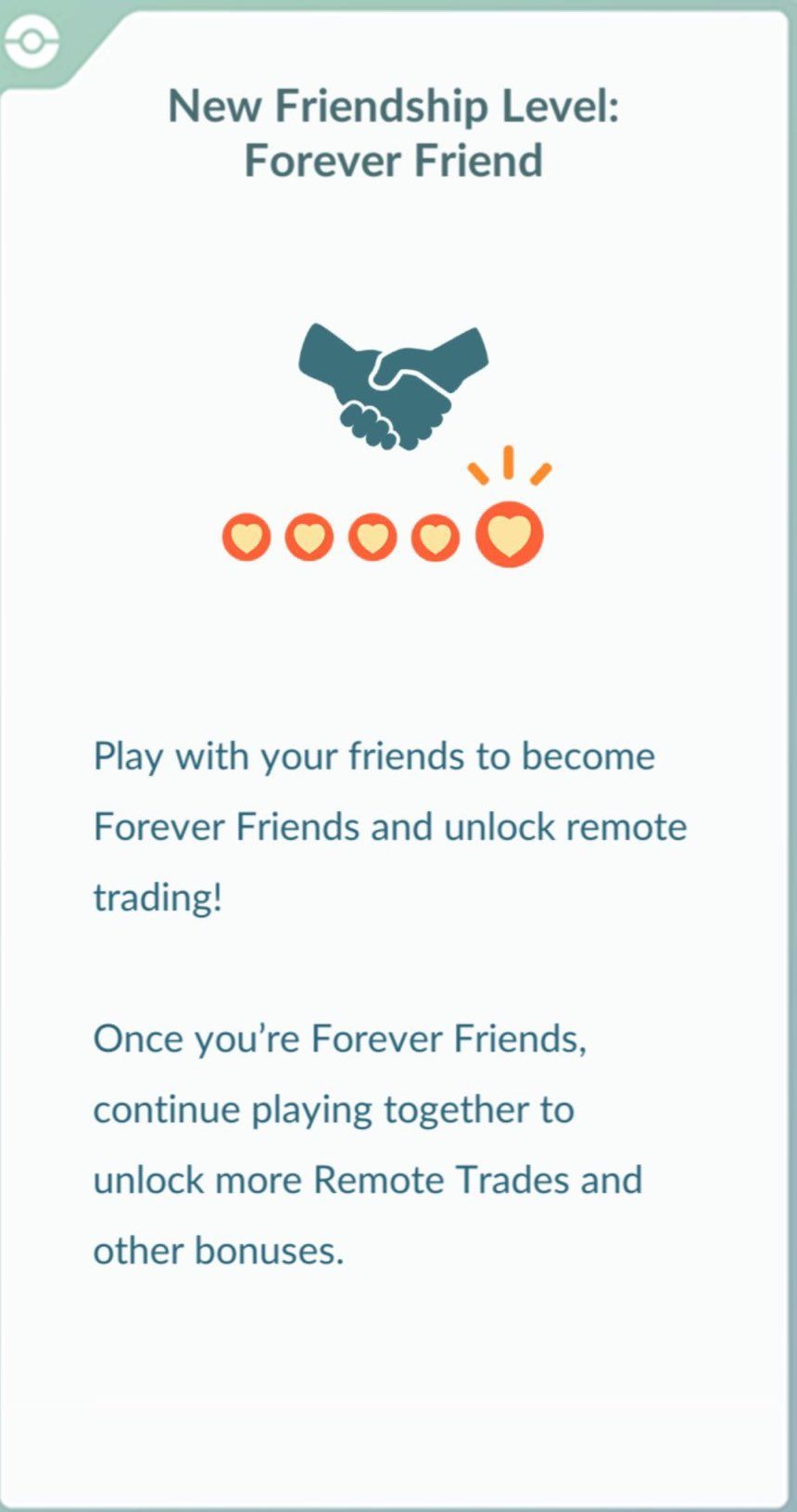 Each day you interact with a Best Friend, you have a small chance to become Lucky Friends, meaning your next trade is guaranteed to be Lucky. With Remote Trades, trainers will earn friendship points by engaging with their Forever Friends, the new highest tier of Friendship in Pokémon GO. Earn enough friendship points to unlock a Remote Trade.
