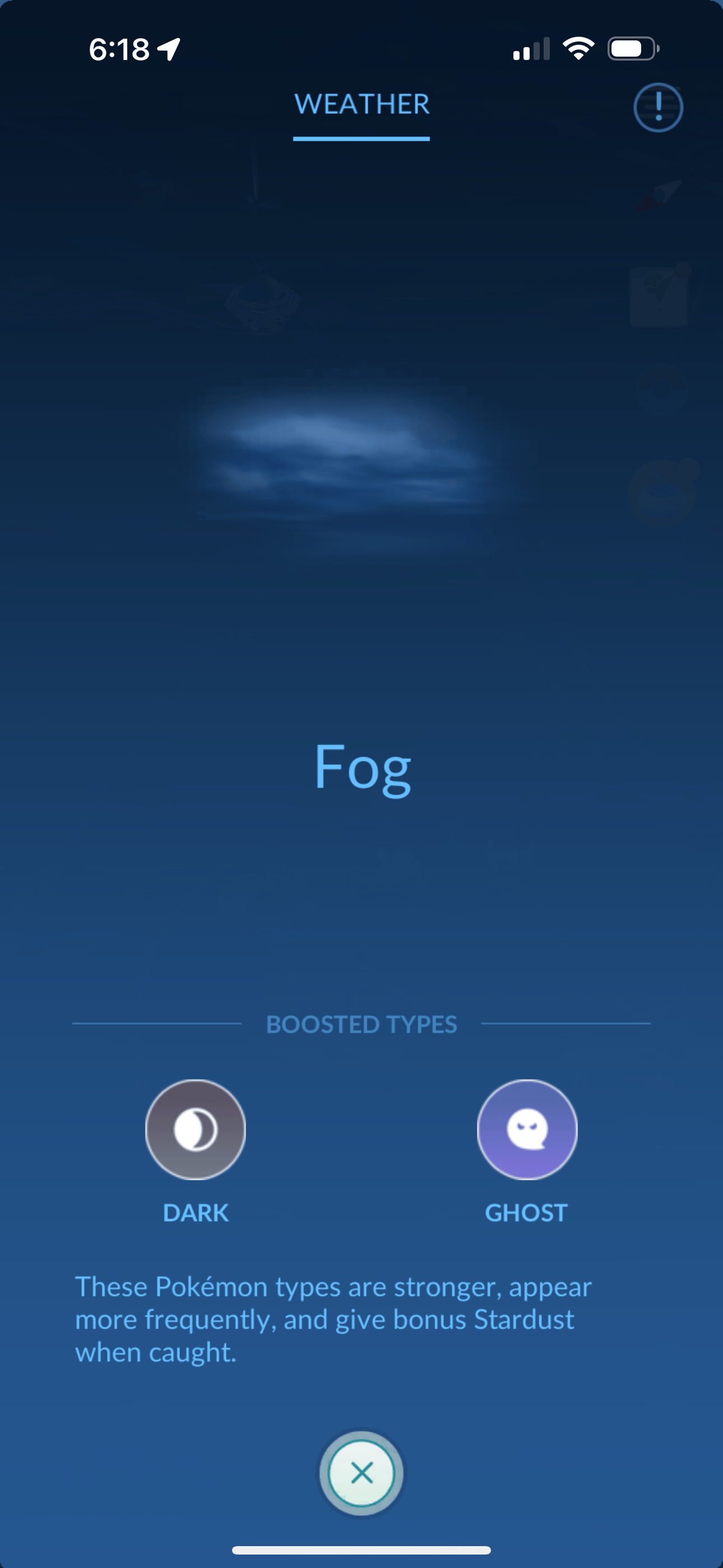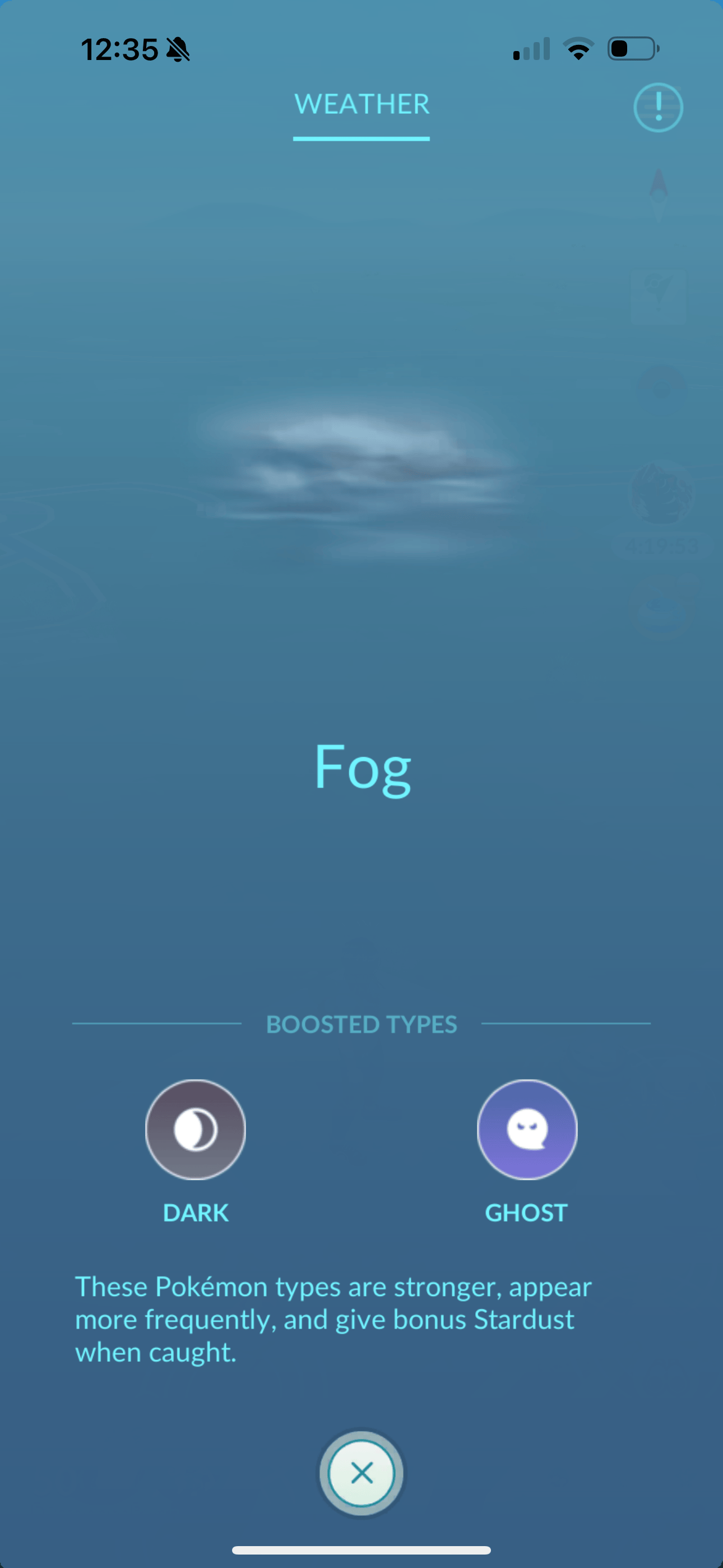Foggy weather in Pokémon GO boosts Ghost- and Dark-types. Pokémon with these types appear more frequently and give 25% more Stardust when caught. Moves with these types are stronger and do 20% more damage.