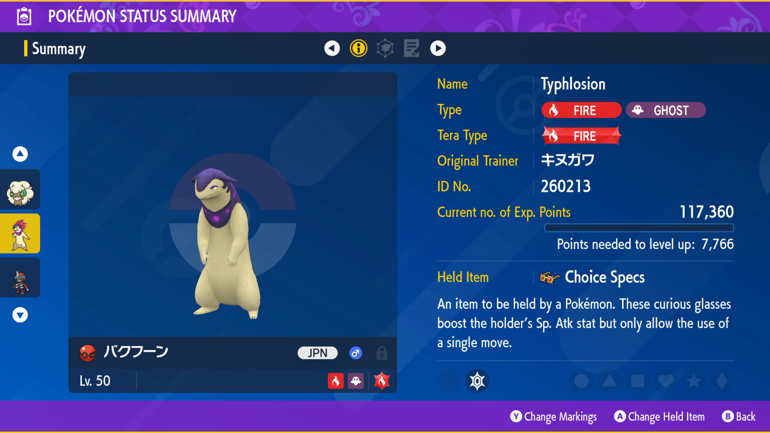 Typhlosion is Lv. 50 and in a Cherish Ball. It has the Fire Tera Type, Blaze ability, and is holding a Choice Specs. Its moves are:
