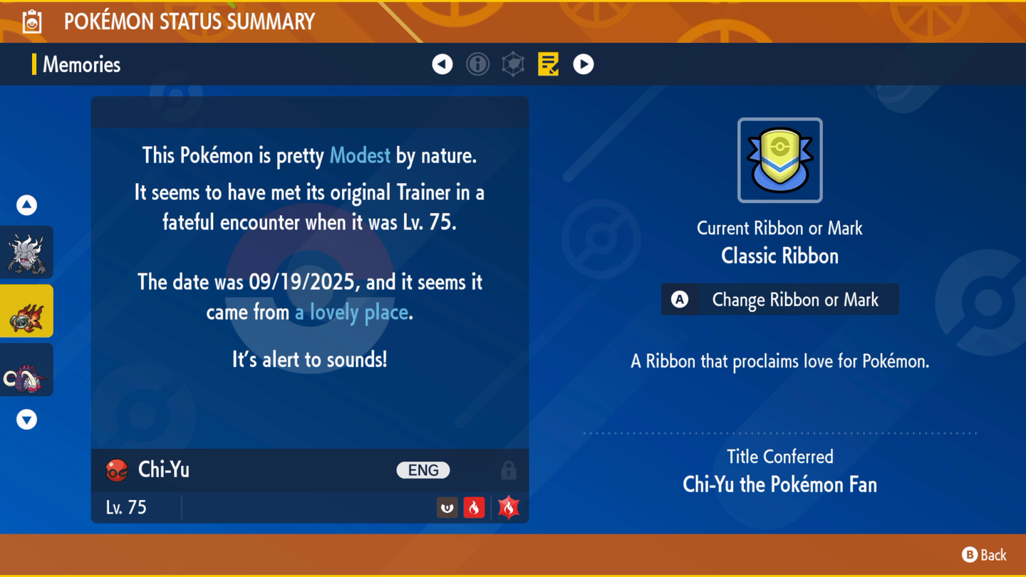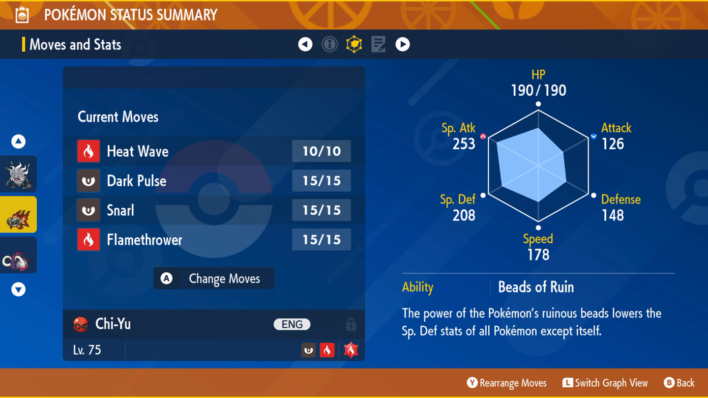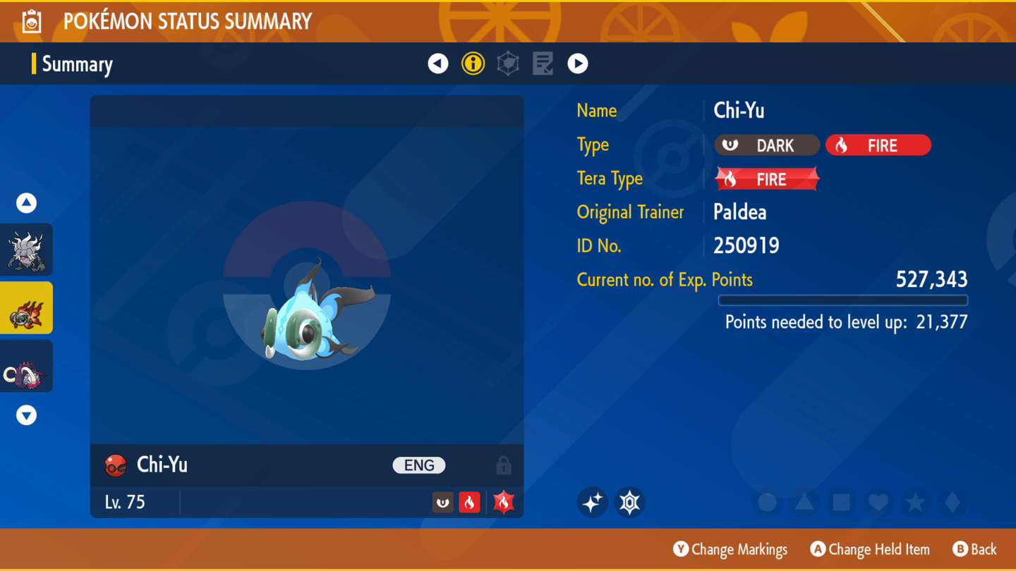 Chi-Yu is Level 75 and in a Cherish Ball. It has the Fire Tera Type and the moves: